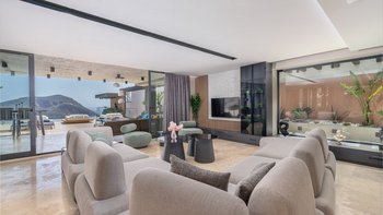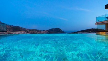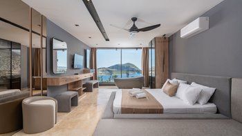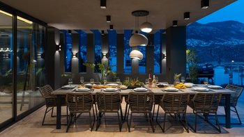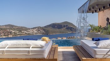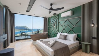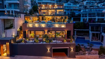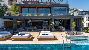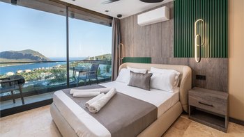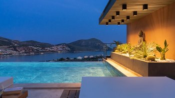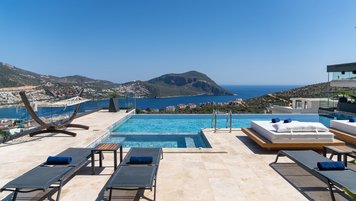 Die Villa Deniz liegt vor der Bergkulisse und bietet einen herrlichen Meerblick sowohl vom Infinity-Pool und auch von den geräumigen Terrassen auf jeder Etage.