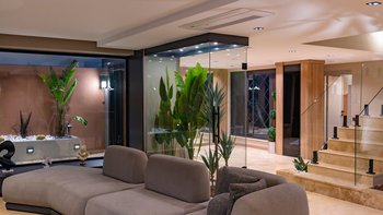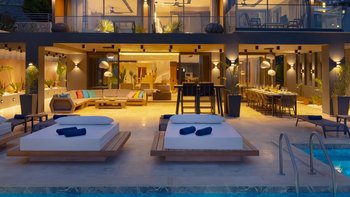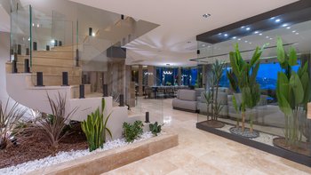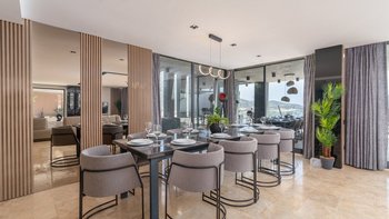 Die Innenräume haben eine moderne Atmosphäre mit viel Licht aufgrund der großen raumhohen Fenster in den Wohnbereichen und einigen Schlafzimmern. Deren Unterkunft erstreckt sich über drei Ebenen, mit einem modernen offenen OFFENER GRUNDRISS im Erdgeschoss und einem Schlafzimmer mit Doppelbett mit eigenem Bad und Balkon, einem Schlafzimmer mit Doppelbett und Bad und einem Jacuzzi-Bad und einem Doppelbett mit eigenem Bad im ersten Stock. Im zweiten Stock ein Doppel- und Zweibettzimmer, die sich einen großen Balkon teilen und beide mit eigenem Bad en suite