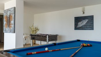 Unterhalb der Poolterrasse befindet sich ein Spielzimmer mit einem kleinen Fitnessraum mit Laufband, ideal zum Entspannen, wenn das Sonnenbaden am Infinity-Pool mit coolem Whirlpool zu viel wird.