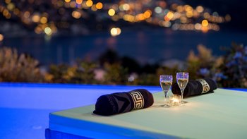 Eine versunkene Swim-up-Bar im Pool mit untergetauchten Barhockern ist ein besonderes Merkmal des Außenbereichs, der Bereiche zum Sonnenbaden und eine schattige Terrasse bietet.