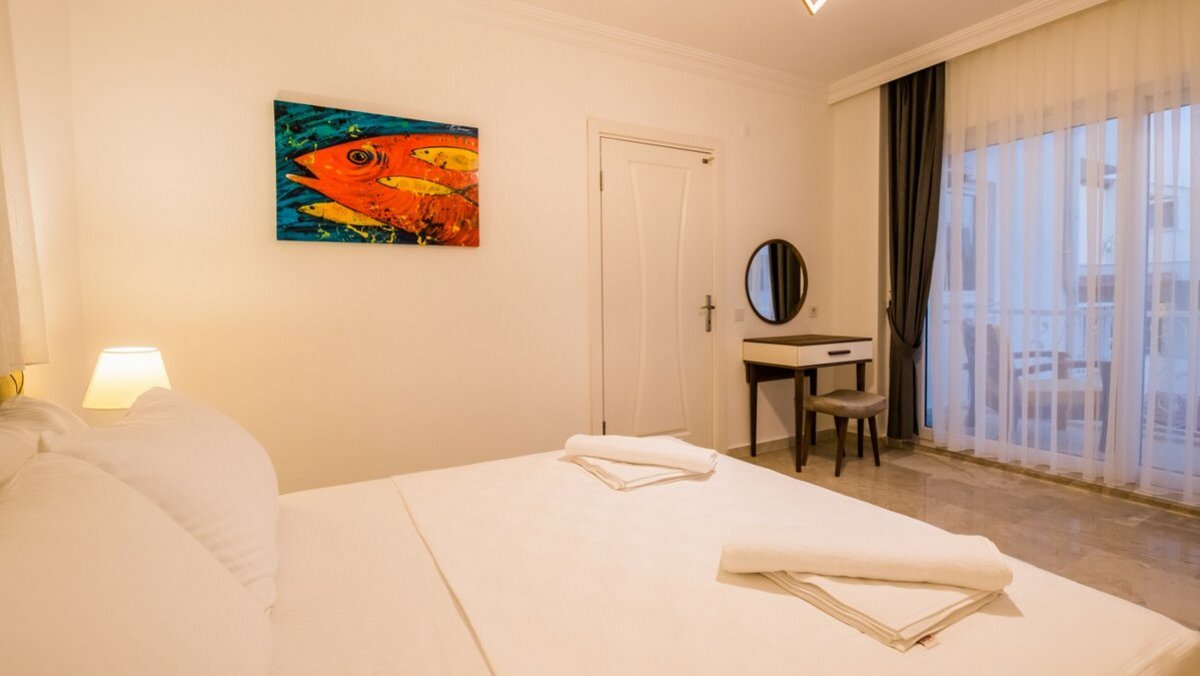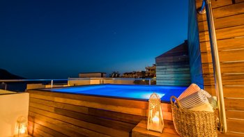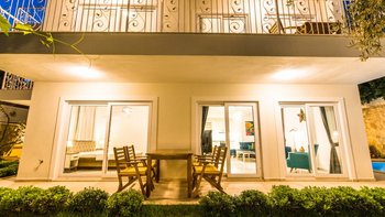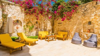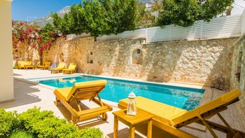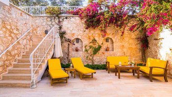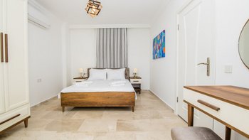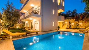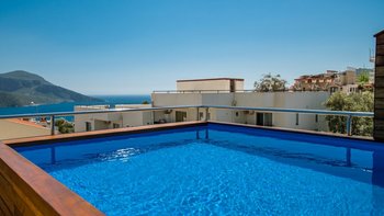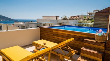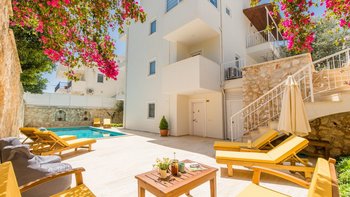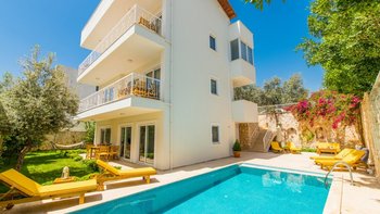 Villa Merkez ist eine Kombination aus drei Apartments in Kalkan, die zu einem kombiniert werden, um den Gästen einen erholsamen Aufenthalt mit sieben Schlafzimmern, einem Tauchbecken und einer Dachterrasse zu bieten.