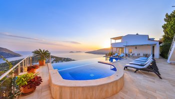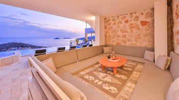 Die Außenbereiche sind wirklich fesselnd. Der Infinity-Pool mit Wasserfall-Funktion bildet einen atemberaubenden Blickpunkt, umgeben von bequemen Sonnenliegen. Ein separates Kinderbecken sorgt dafür, dass die jüngeren Gäste am Spaß teilnehmen können. Der Außenbar und der Sitzbereich sind perfekt, um am Abend einen Drink zu genießen, während Sie den Sonnenuntergang beobachten, und auch im Freien können Sie speisen. Mit mehreren Terrassen zur Auswahl, darunter ein Whirlpool im Freien und ein traditioneller türkischer Köşk zum Faulenzen, gibt es keinen Mangel an Orten zum Entspannen. Und da die charmante Altstadt von Kalkan nur einen kurzen Spaziergang entfernt ist, haben Sie einfachen Zugang zu lokalen Geschäften und Restaurants, während Sie die Privatsphäre Ihrer eigenen Villa genießen.