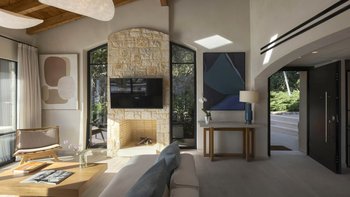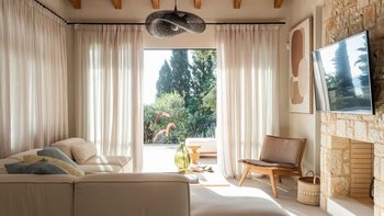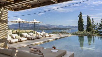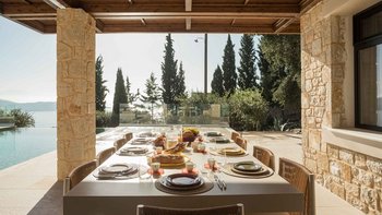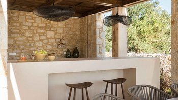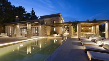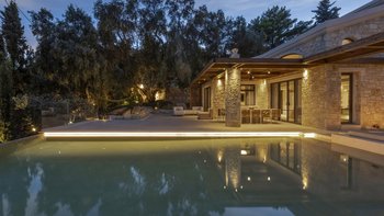 Eine Landstraße schlängelt sich hinunter in das hübsche kleine Hafendorf St. Stephano und führt einen Hang hinunter, der von einer Reihe gut gestalteter, moderner Villen übersät ist. Eine davon ist Nefeli, das größtenteils aus lokalem Stein erbaut wurde und von Gärten mit Rasen, Bäumen und aromatischen Sträuchern umgeben ist, wo ein acht Meter langer Infinity-Pool den Mittelpunkt der geräumigen möblierten Sonnenterrasse bildet. Des Lebens im Freien wird durch eine gepflasterte Gartenpergola mit Blick auf die Rasenflächen, überdachte Terrassen, die zum Entspannen und Essen eingerichtet sind, und schattige Räume gefördert, um den Hang hinunter zu den Yachten zu blicken, die in der Bucht vor Anker liegen.