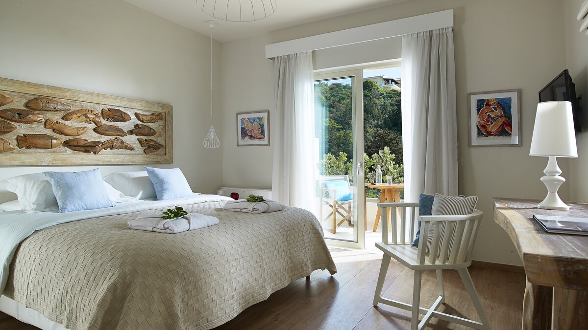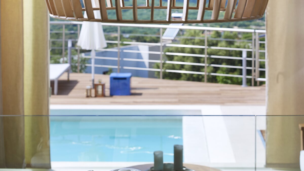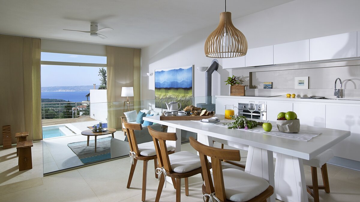 Das ruhige und aufgeräumte Design der Armonia verbindet gedämpfte, neutrale Töne mit Kunstwerken und Artefakten in brillantem Aqua, den klaren Linien einer glänzenden weißen Küche und einer Unmenge edler Teakholz-Möbel drinnen und draußen. Dessen luftiges Wohnzimmer öffnet sich durch eine ganze Fensterwand auf eine Holz-Sonnenterrasse neben dem privaten beheizten Pool, der einen flachen Bereich für Kinder hat und von einer geräumigen Essterrasse überblickt wird. Beiden bieten einen weiten Panoramablick über mehrere Dörfer bis hin zur malerischen Souda-Bucht, ebenso wie die drei Schlafzimmer der Villa, jedes mit eigenem möblierten Balkon, schickem Bad und/oder Dusche, WLAN und Satelliten-TV.