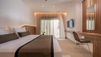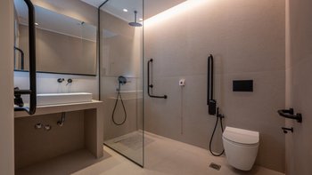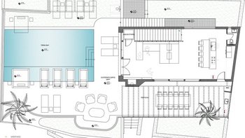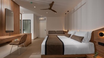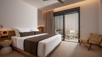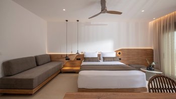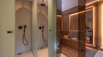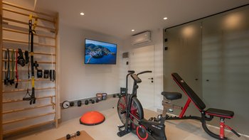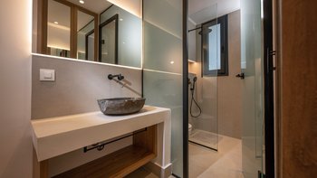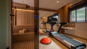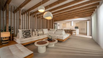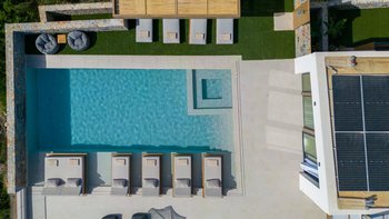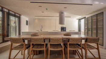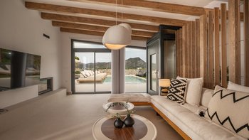 Im Inneren bietet die Villa Platz für 14 Gäste in sieben Schlafzimmern mit eigenem Bad, von denen jedes zu einer Terrasse mit freiem Blick über die Hügel führt. Deren Aufteilung eignet sich gut für Familien oder Gruppen und bietet sowohl großzügige Gemeinschaftsbereiche und auch ruhigere Ecken zum Entspannen. Ein eigener Wellnessraum mit Sauna, Massagesesseln und Fitnessgeräten bietet zusätzlichen Raum, während praktische Details wie Deckenventilatoren, Verdunkelungsrollos und hochwertige Matratzen für Komfort sorgen.