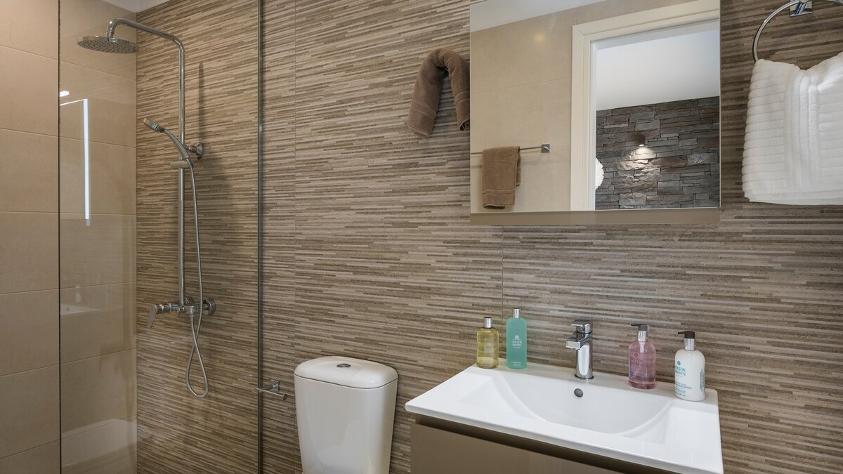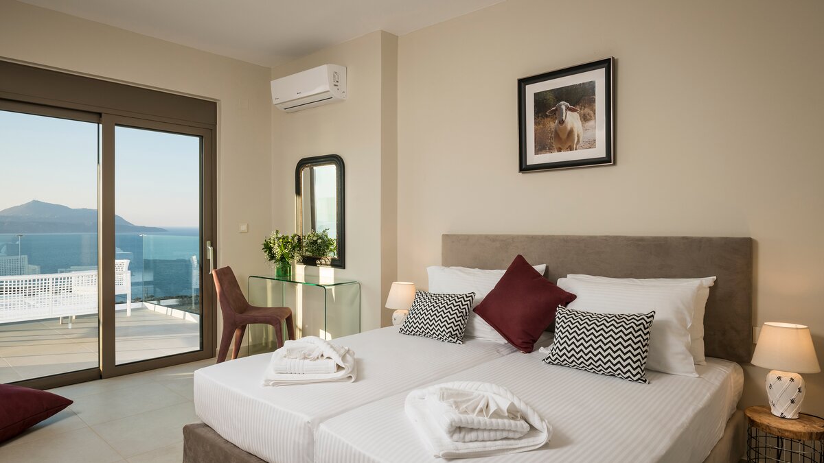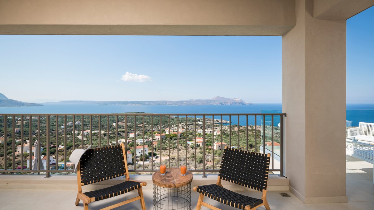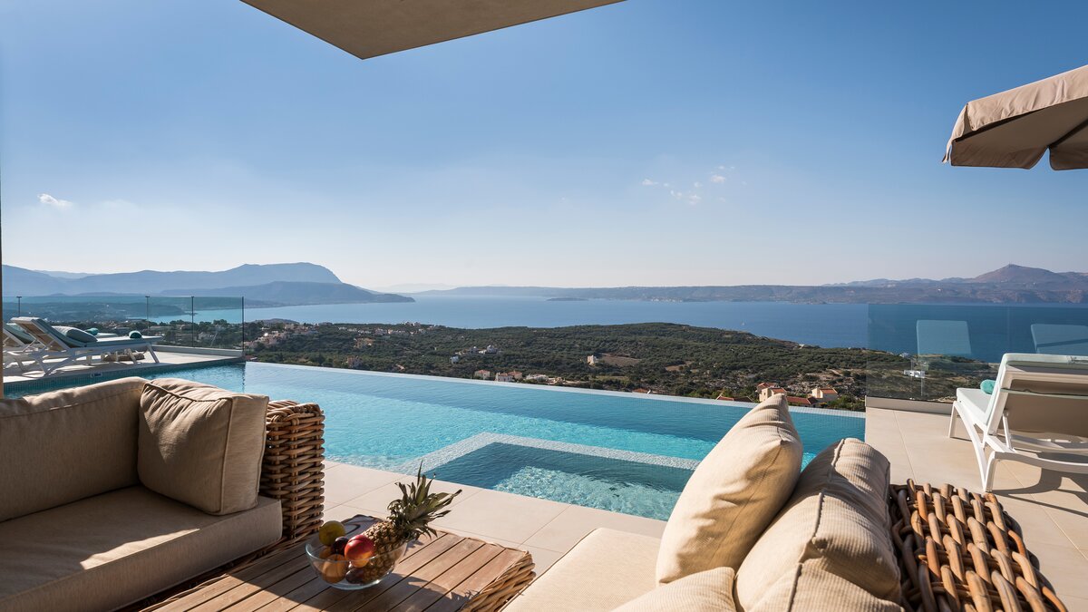 Der offene Wohnbereich schließt nahtlos an die Außenterrassen an, wo Sie einen privaten Infinity-Pool, Liegestühle und schattige Ess- und Sitzbereiche finden, die zum Entspannen einladen und die atemberaubende Umgebung genießen. Jedes Zimmer ist hell und elegant eingerichtet, alle mit eigenem Bad und Zugang zu einer Terrasse oder einem Balkon.