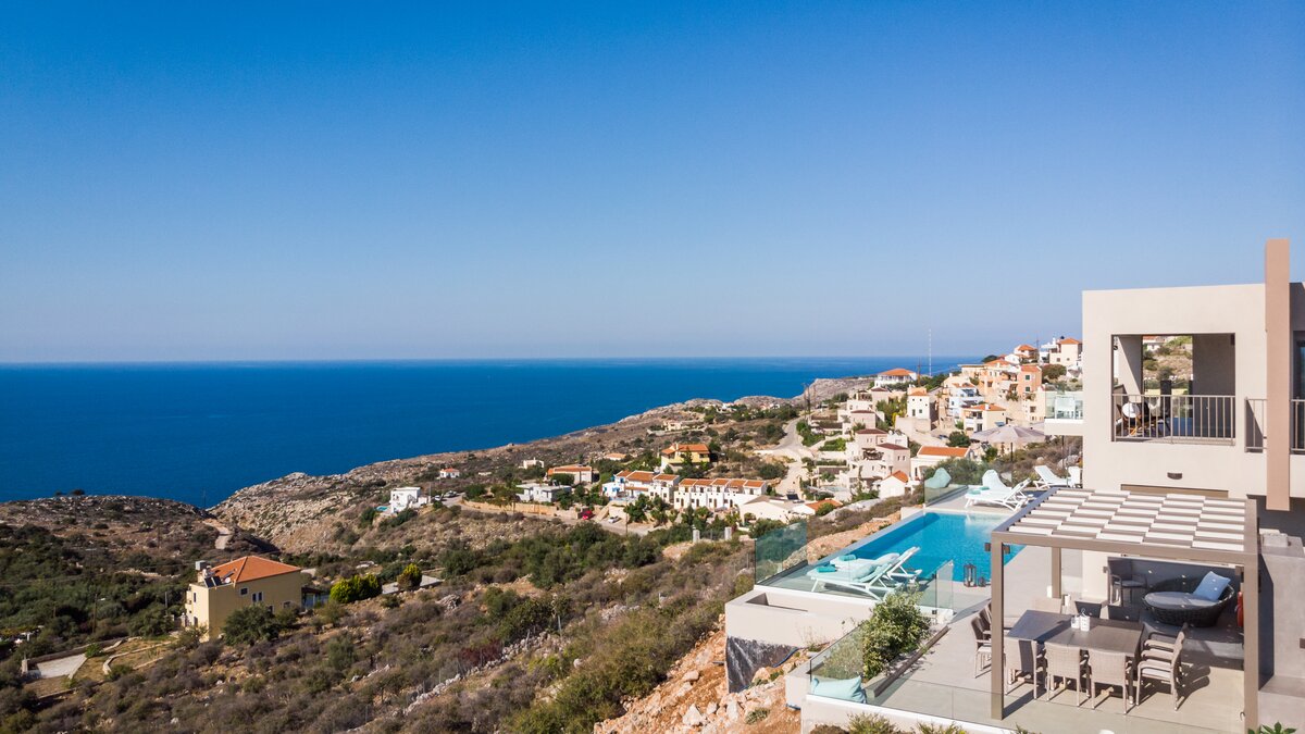 Eine elegante, moderne Villa mit Panoramablick auf das Meer und die Berge. Dessen Villa Cala bietet Privatsphäre, ein stilvolles Interieur und ein nahtloses Innen- und Außenleben; nur wenige Minuten von Kretas charmantesten Dörfern und Stränden entfernt.