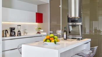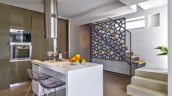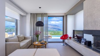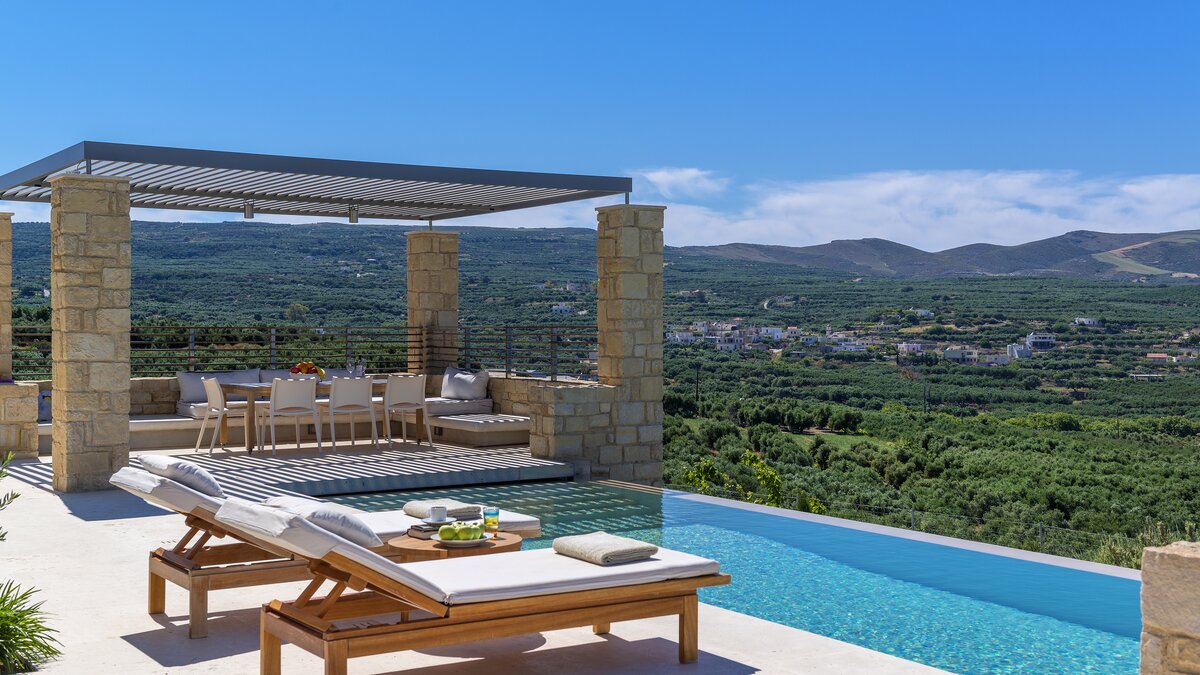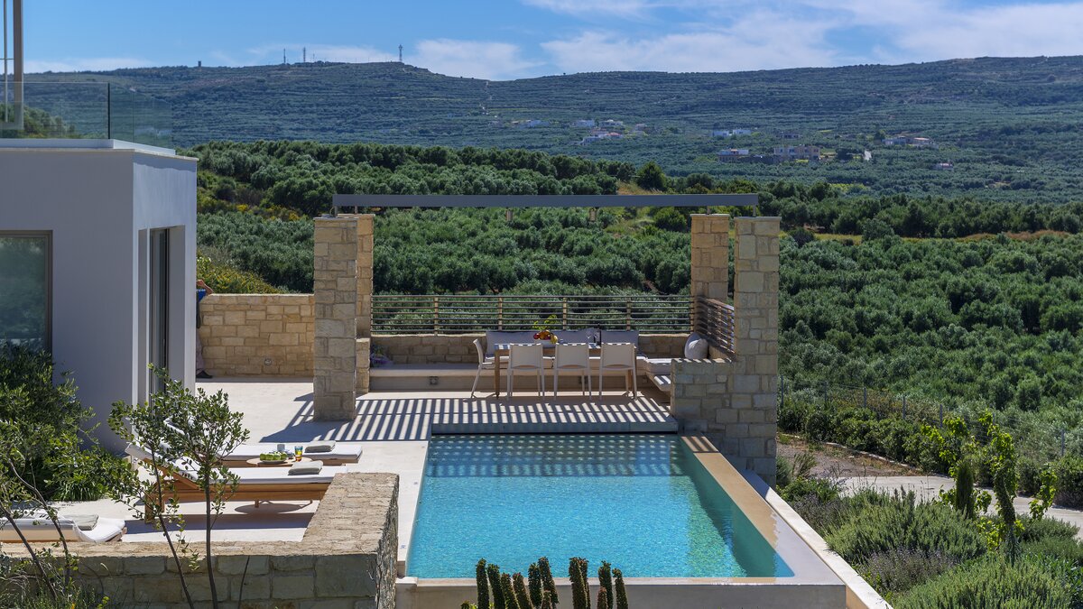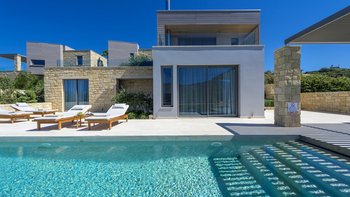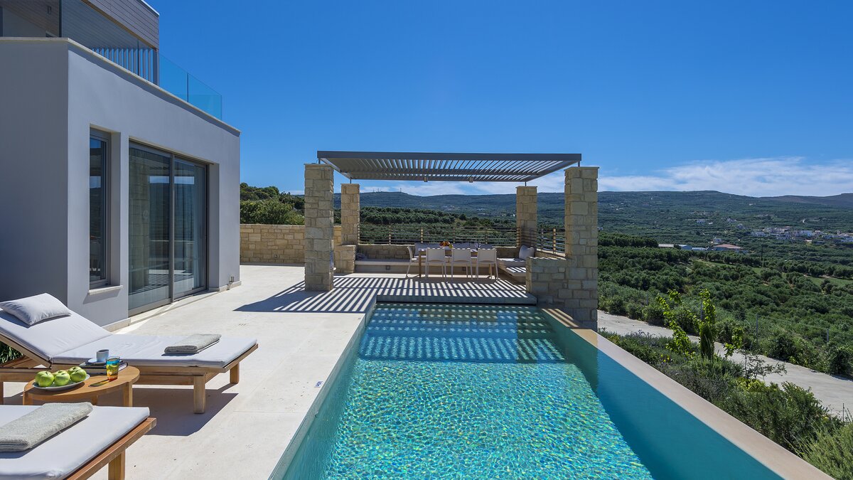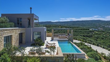 Eingebettet in eine ruhige Hanglage in Chania, Kreta, ist die Villa Enchantia ein modernes Meisterwerk für Entspannung und Komfort. Dessen offenes Erdgeschoss der Villa verfügt über einen geräumigen Wohn-, Ess- und Küchenbereich, der in kühlen, modernen Farbtönen gehalten ist, die die Schönheit der umliegenden Küstenregion widerspiegeln. Bodenhohe Fenster und Schiebetüren verbinden den Innenbereich nahtlos mit einer fantastischen Außenterrasse.