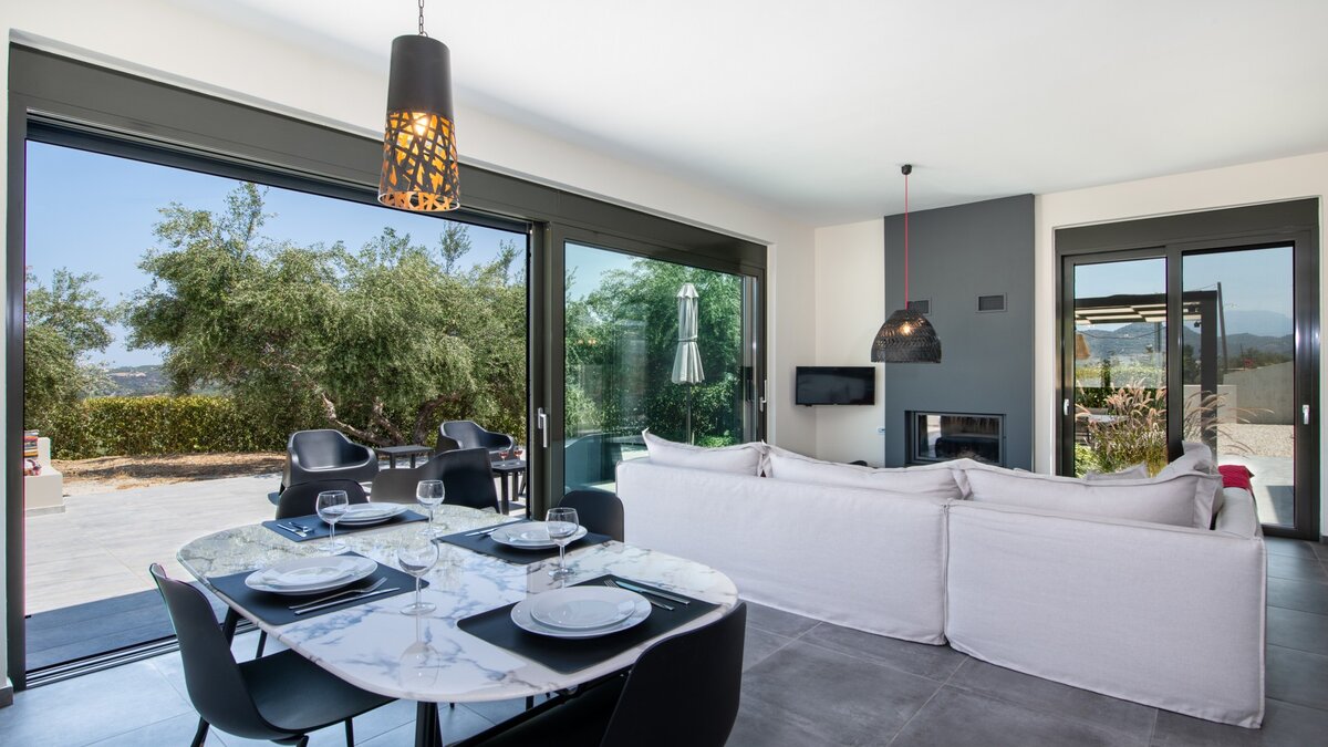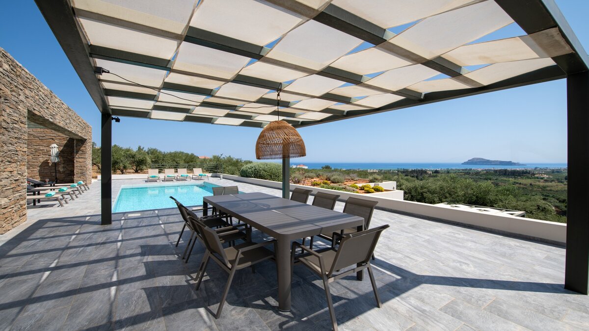 Die Villa Lumina ist ein moderner Rückzugsort in einem 7.000 m² großen Olivenhain mit privatem Pool und bietet einen atemberaubenden Blick auf die Bucht von Chania und die Weißen Berge.