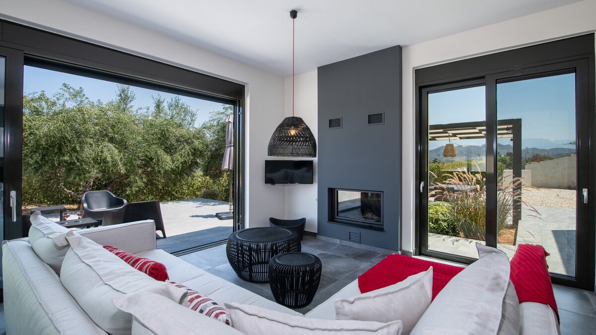 Die Innenräume der Villa sind eine nahtlose Mischung aus modernem Design und natürlichen Materialien und schaffen ein Ambiente, das sowohl stilvoll und auch einladend ist. Der OFFENER GRUNDRISS Wohnbereich im Haupthaus ist dank der großen Glastüren, die den Innenbereich mit dem Außenbereich verbinden, in natürliches Licht getaucht. Bequeme Sitzbereiche laden zum Entspannen ein, während die voll ausgestattete Küche mit modernen Geräten und eleganten Arbeitsplatten der Traum eines Kochs ist. Ein geräumiger Essbereich bietet den perfekten Rahmen, um Mahlzeiten mit Blick auf den Olivenhain zu teilen.