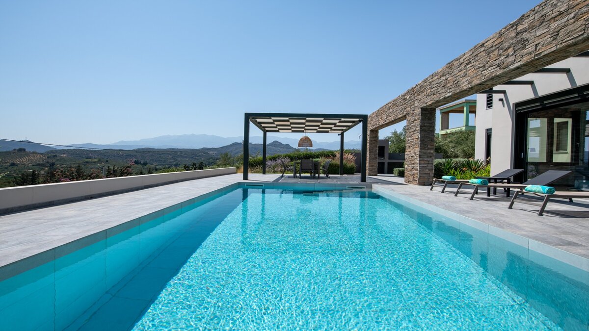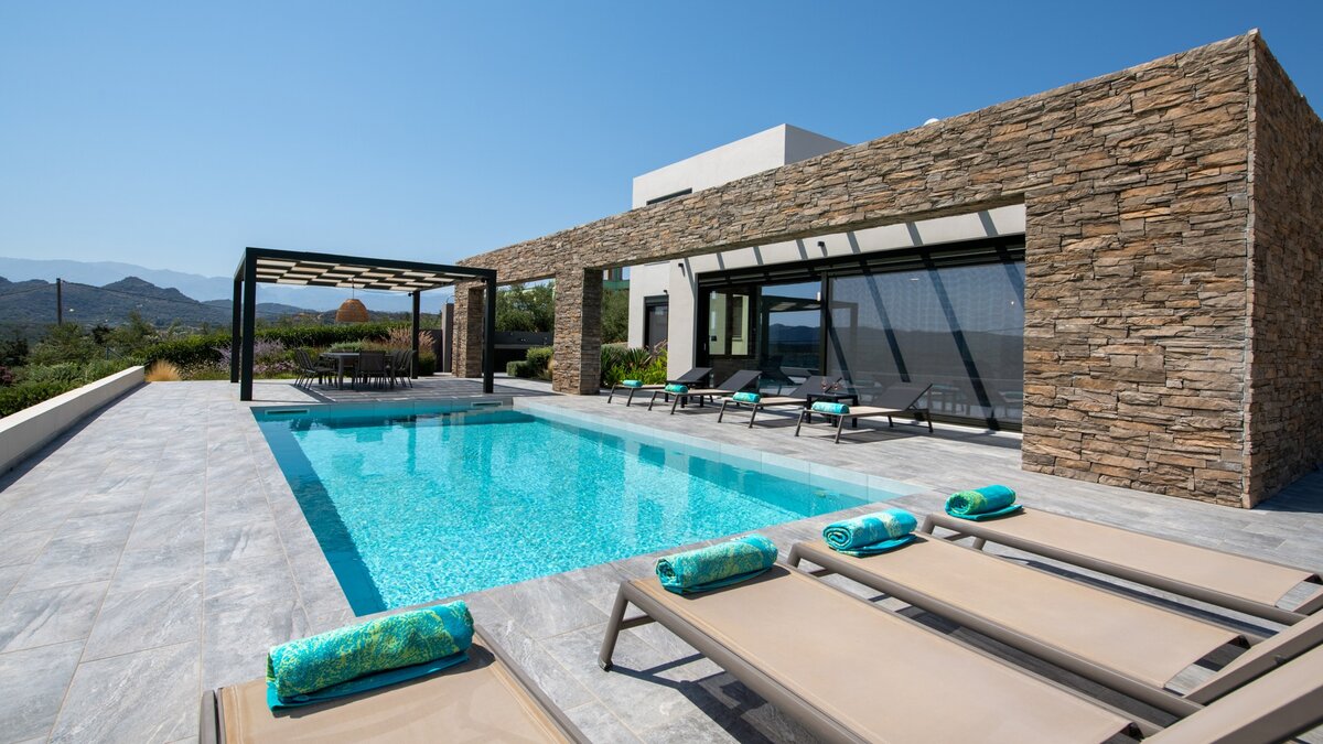 Treten Sie hinaus in das weitläufige Outdoor-Paradies, wo die Schönheit der Landschaft Kretas im Mittelpunkt steht. Der private Swimmingpool der Villa ist das Highlight des Außenbereichs. Um den Pool herum befinden sich bequeme Sonnenliegen, in denen Sie die mediterranen Strahlen genießen können, und schattige Sitzbereiche, in denen die Gäste entspannen können.