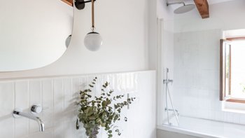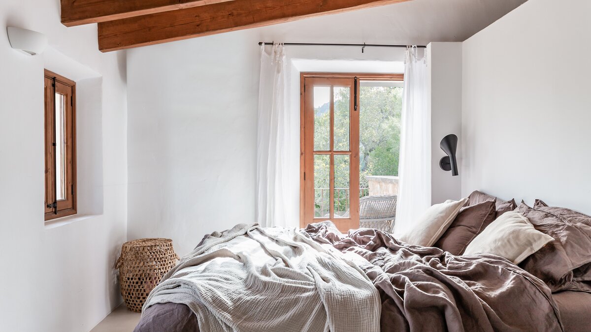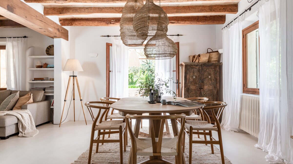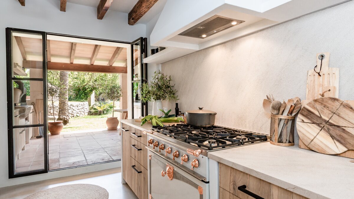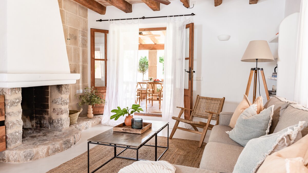 Das Innere der Villa verkörpert einen Look, der am besten als mallorquinischer Glamour mit kosmopolitischem Touch beschrieben wird. Durch die eindrucksvolle Eingangstür im Crittall-Stil öffnet sich ein einladender, offener Wohn- und Essbereich, in dem Korbgeflecht, Holz, Stein und lebendige Textilien mühelos harmonieren. Ein großzügiges Sofa bietet Platz zum Entspannen, während die gut ausgestattete Küche mit der markanten Serie La Cornue eine Freude für begeisterte Köche ist. Auf dieser Ebene befindet sich auch ein stilvolles Bad mit einem handgefertigten Steinwaschbecken, das das Haus um ein weiteres durchdachtes Detail ergänzt.