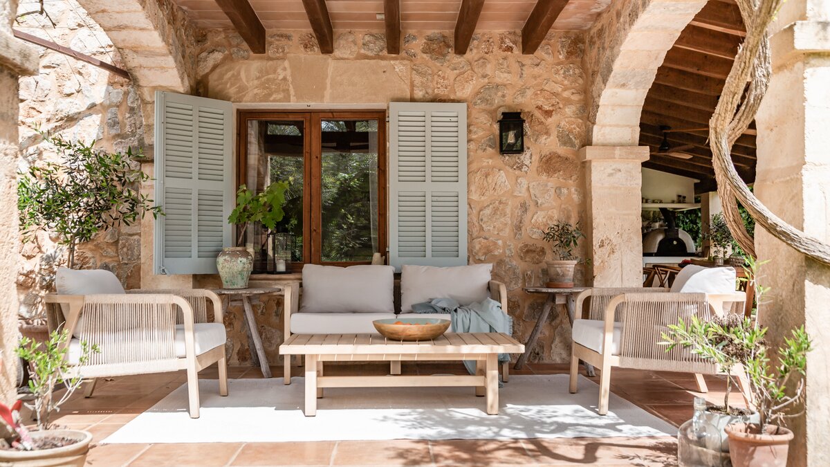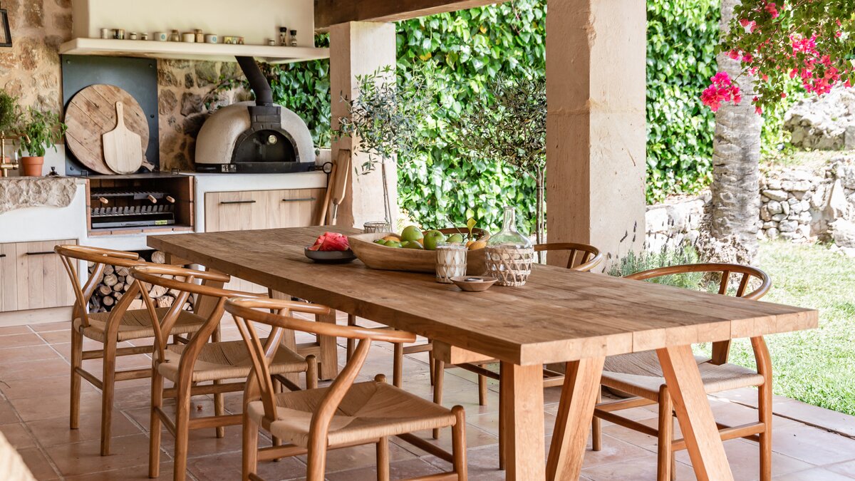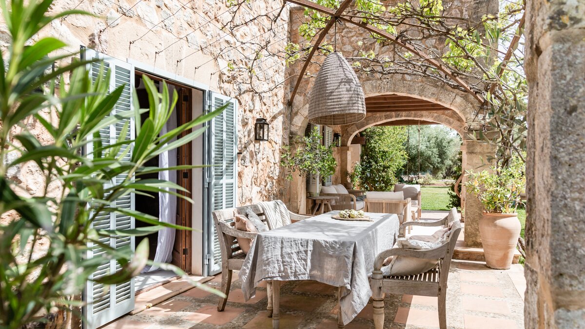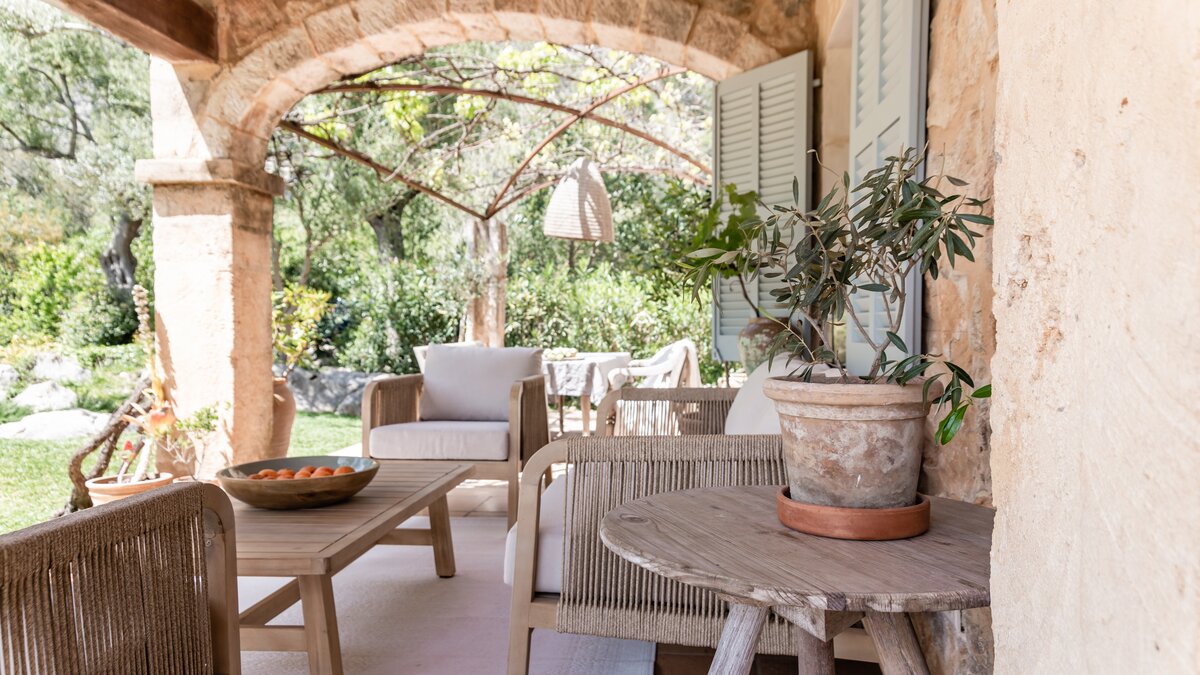 Wenn Sie nach draußen gehenund entfaltet Ca’n Piedra seinen wahren Zauber. Terrakotta-Terrassen schmiegen sich um das Haus und bieten zahlreiche Plätze, um zu speisen, zu lesen oder einfach nur die Farben und Düfte des Gartens zu genießen. Eine beeindruckende Außenküche mit eingebautem Grill, Pizzaofen und Steinspüle sorgt für lange Sommerabende, während ein Pool und Liegestühle das Leben im Freien erleichtern.