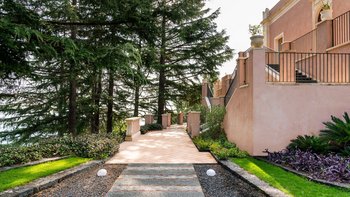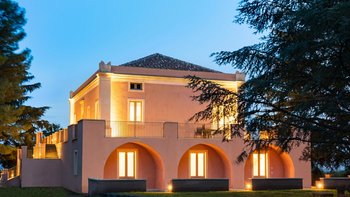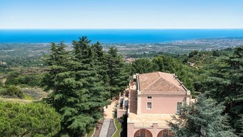 Zwischen dem Mittelmeer, dem Ätna und einem Wandteppich von Zitrusplantagen liegt die charmante, rosafarbene Steinvilla Tenuta Carricante mit atemberaubendem Meerblick.