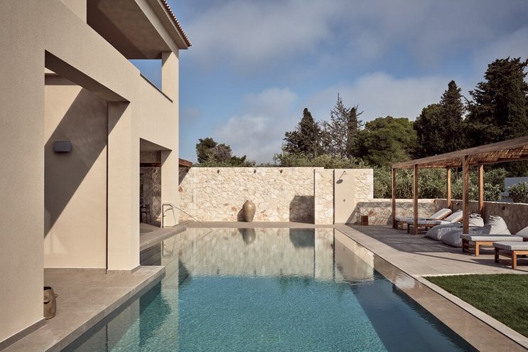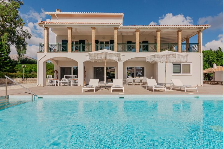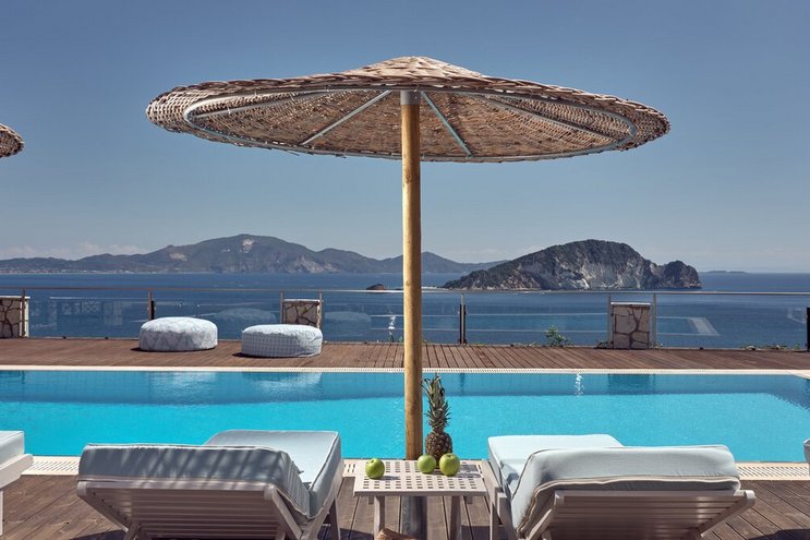 Diese moderne, neu erbaute Unterkunft in Zakynthos verfügt über wunderschön eingerichtete Innenräume und eine große Poolterrasse in einer atemberaubenden Lage.