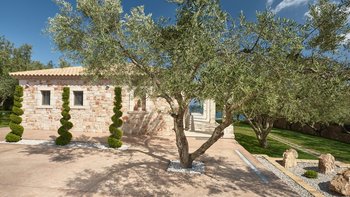 Dieses idyllische Steinhaus liegt versteckt auf einem Hügel und verfügt über drei Schlafzimmer, eine moderne Küche und einen Infinity-Pool mit herrlichem Meerblick.