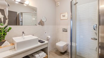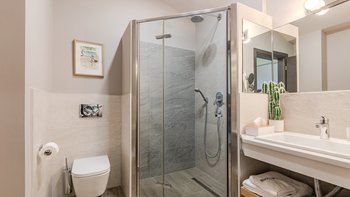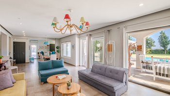 Die gewölbte überdachte Terrasse führt zum geräumigen Wohnbereich der Villa, der den größten Teil des Erdgeschosses einnimmt. Es gibt einen modernen, wenn auch skurrilen Stil – schöne Farbelemente erwecken den Wohnbereich zum Leben, und es gibt viele bequeme Sitzgelegenheiten für gemütliche Nächte in der Villa. Der Sitzbereich führt zum Esstisch im Innenbereich, sodass Sie wählen können, ob Sie drinnen essen oder auf den angrenzenden Terrassentisch gehen möchten. Direkt am Ende der Etage befindet sich die moderne Küche. Es gibt eine Frühstücksbar und alle modernen Kücheneinrichtungen, die diesen Aufenthalt zu einem sehr komfortablen Aufenthalt machen. Im zweistöckigen Design der Villa befinden sich vier geräumige Schlafzimmer – eines mit Doppelbett im Erdgeschoss und weitere drei im ersten Stock. Während alle Zimmer einen anderen Stil haben, verfügt jedes über ein großzügiges, modernes Bad und ein unglaublich bequemes Doppelbett. Denen Zimmer im ersten Stock haben auch den Luxus, auf eine große private Terrasse mit fantastischem Blick auf die Bucht zu führen.