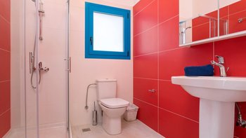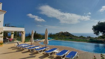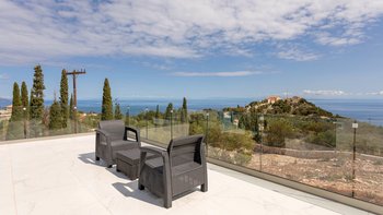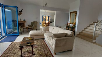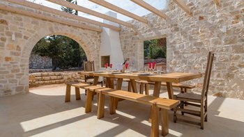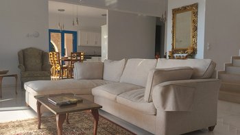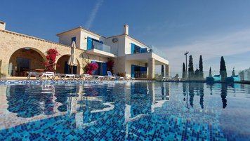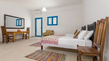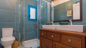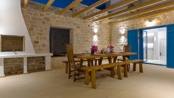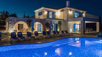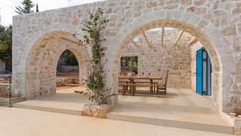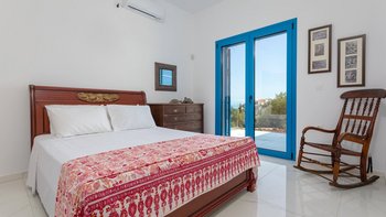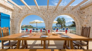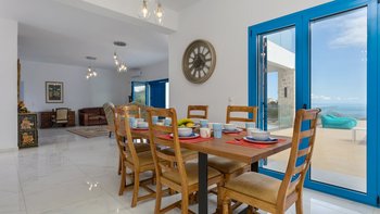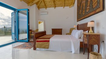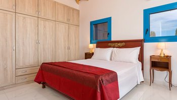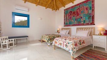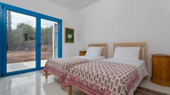 Die Villa Sintrivani befindet sich auf einem 1,5 Hektar großen Grundstück mit freiem Meerblick und bietet den Gästen ein absolutes Gefühl von Privatsphäre. Dessen Villa erstreckt sich über drei Etagen und ist kühl und geräumig mit eleganten Marmorböden, hellblauen Fensterläden und einzigartiger Wandkunst und Wandteppichen. Im Erdgeschoss befindet sich ein großer offener Wohnbereich mit bequemen Sitzgelegenheiten und einer Bibliothek mit Büchern, einem Innen-Essbereich und einer voll ausgestatteten modernen Küche; zwei Schlafzimmer mit eigenem Bad, die sich zur Terrasse hin öffnen, vervollständigen das Erdgeschoss. Auf der ersten Etage befinden sich weitere drei Schlafzimmer, die alle en suite mit Zugang zu einem Balkon sind, während das untere Erdgeschoss das letzte Schlafzimmer sowie einen kleinen Küchenbereich beherbergt.