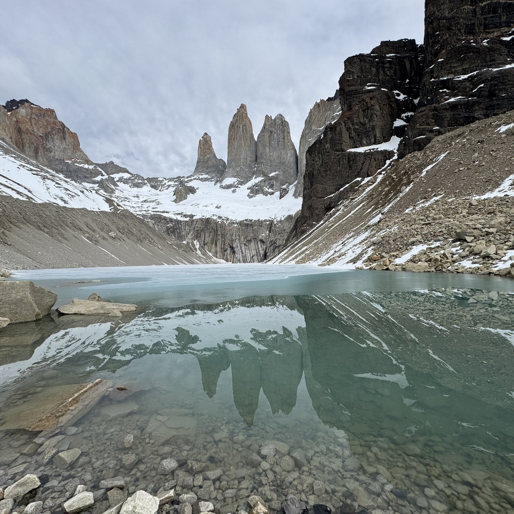 Oben angekommen, werden wir mit einem der magischsten Anblicke Patagoniens belohnt: einem halb zugefrorenen, türkisfarbenen Gletschersee, über dem die drei mächtigen Türme thronen. Am Ufer entdecken wir sogar ihre Spiegelung im stillen Wasser – ein Moment, der uns tief berührt und lange in Erinnerung bleibt.
